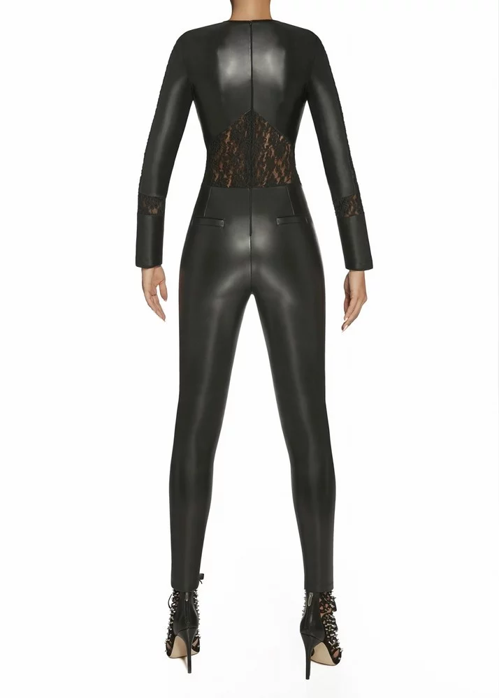 Sexy kombinéza, která je vyrobená z eko kůže a svůdné krajky. Kombinéza má kulatý výstřih, dlouhé rukávy a vzadu se zapíná na zip. V zadní části jsou umístěné patky imitující kapsičky. Jemnost: 200 DEN.Materiál ECO-LEATHER imituje kůži, je plně kryjící, elastický a modeluje postavu. Tento materiál je vyrobený z přízí renomovaných producentů s mezinárodním certifikátem Oeko-Tex.Materiálové složení: 100 % polyester.