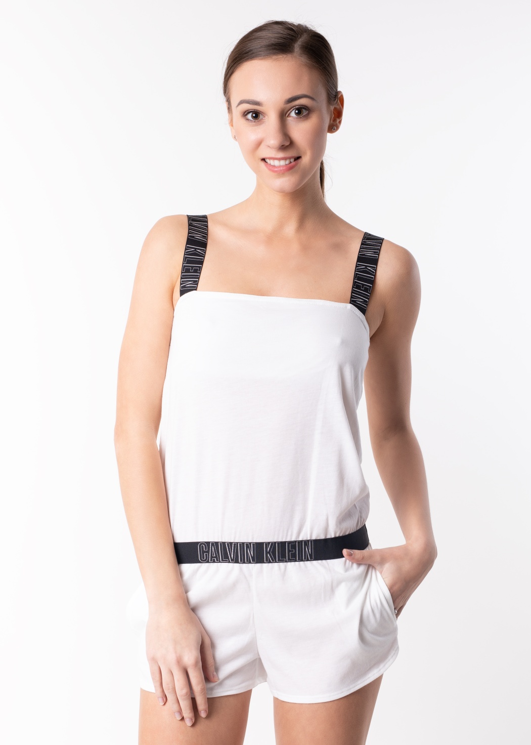 Dámský krátký overal značky Calvin Klein z letní kolekce 2019. Letní overal šortkového typu s výraznými prvky širší gumy se značkou CALVIN KLEIN na ramínkách a v pase. Přední i zadní výstřih je rovný, v zadní části sahá k lopatkám. Přes prsa je uvnitř overalu všitá lambáda. V šortkách v bocích jsou skrytě všité kapsičky. Overal je ideální do horkých letních dnů.