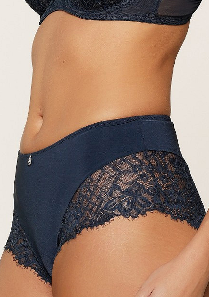 Elegantní kalhotky LingaDore v odstínu Midnight Blue spojují pohodlí a ženský půvab. Vyšší střih krásně vytvaruje siluetu a poskytuje příjemné krytí, zatímco zadní část z jemné krajky s třpytivými detaily působí svůdně a sofistikovaně. Přední hladký díl je doplněn drobným kovovým logem značky, které podtrhuje luxusní vzhled. Díky pružnému materiálu a preciznímu zpracování kalhotky perfektně sedí a zaručují maximální komfort při nošení. Ideální doplněk k podprsence ze stejné kolekce.