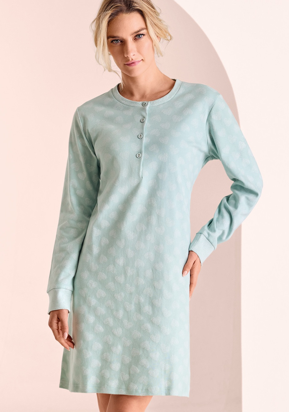 Dámská vzorovaná noční košile italské značky Infiore. Košile má dlouhý rukáv, který je ukončený úplety. Délka košile je nad kolena. Košile má légu na čtyři knoflíky. Košile je ušitá z velmi příjemné hřejivé bavlny.