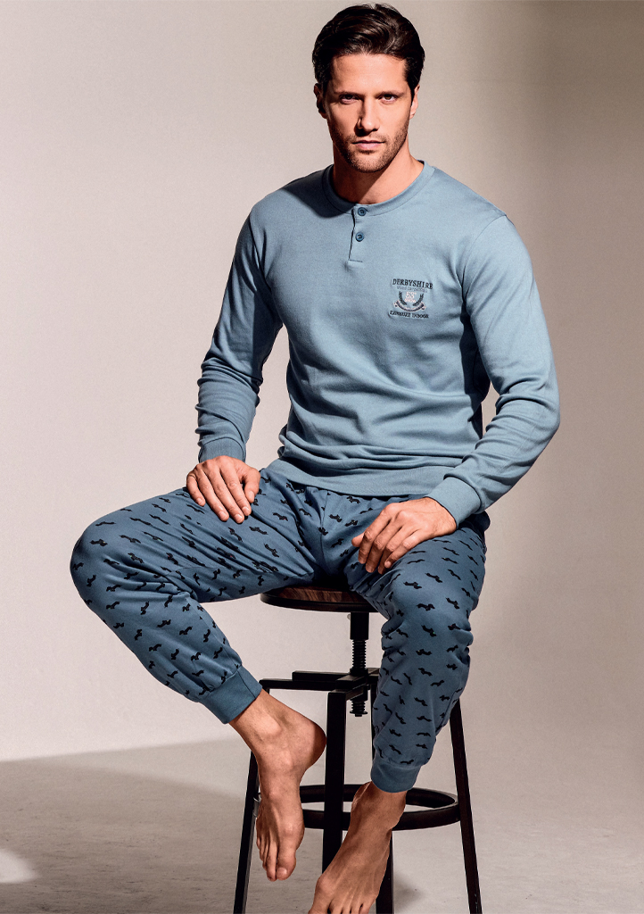 Moderní pánské pyžamo značky Infiore spojuje pohodlí, styl a kvalitní zpracování. Horní díl v příjemné modré barvě má dlouhé rukávy, kulatý výstřih s rozepínáním na knoflíčky a decentní potisk na hrudi. Kalhoty v odpovídajícím odstínu jsou zdobeny jemným vzorem a zakončené pružnými manžetami pro maximální komfort při nošení. Pyžamo je vyrobeno z měkké bavlny, která je prodyšná a příjemná na dotek, ideální pro klidný spánek i domácí pohodu. Baleno v praktické krabičce, takže je také skvělým tipem na dárek.