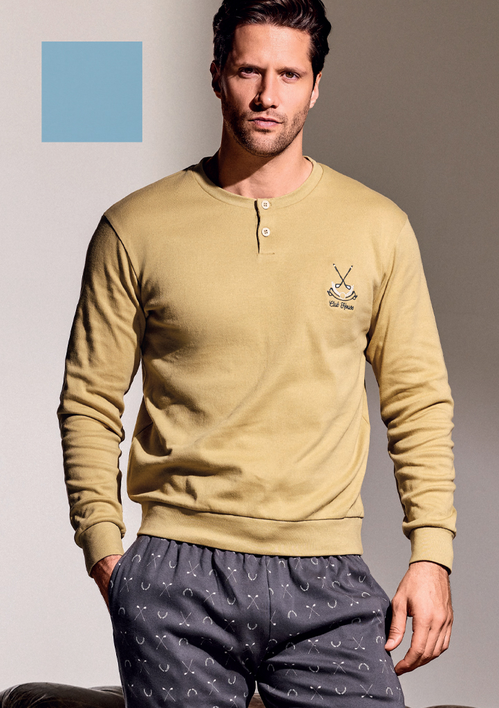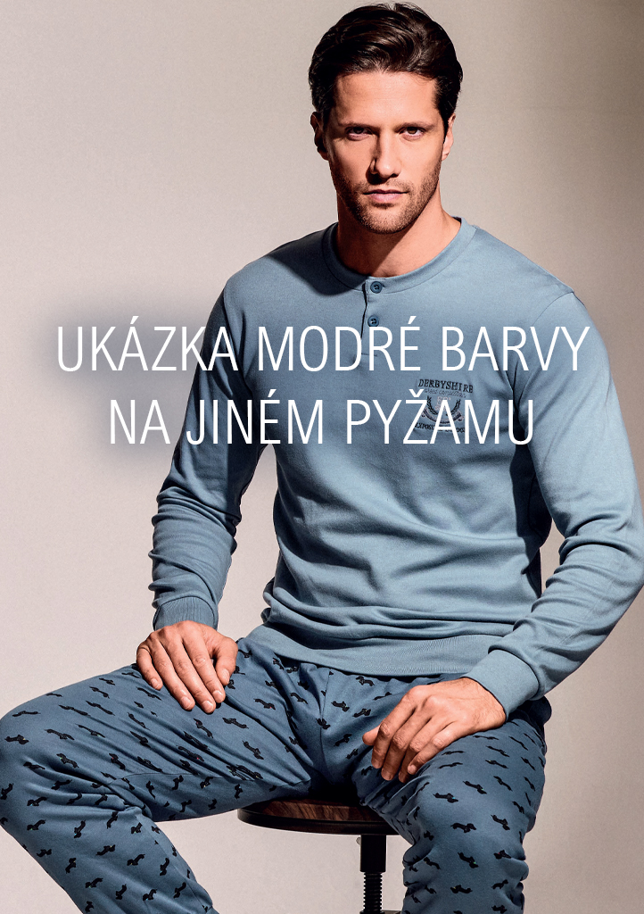 fotografii, spojuje pohodlí a moderní vzhled. Horní díl má kulatý výstřih s krátkým zapínáním na knoflíčky a decentní potisk na hrudi. Kalhoty jsou v o něco tmavším modrém tónu, zdobené jemným vzorem a zakončené pružnými manžetami, které zajišťují pohodlí při nošení. Pyžamo je vyrobeno z měkké, prodyšné bavlny, ideální pro klidný spánek i domácí relax. Baleno v elegantní krabičce, takže se skvěle hodí i jako dárek.Materiálové složení: 100% bavlna.