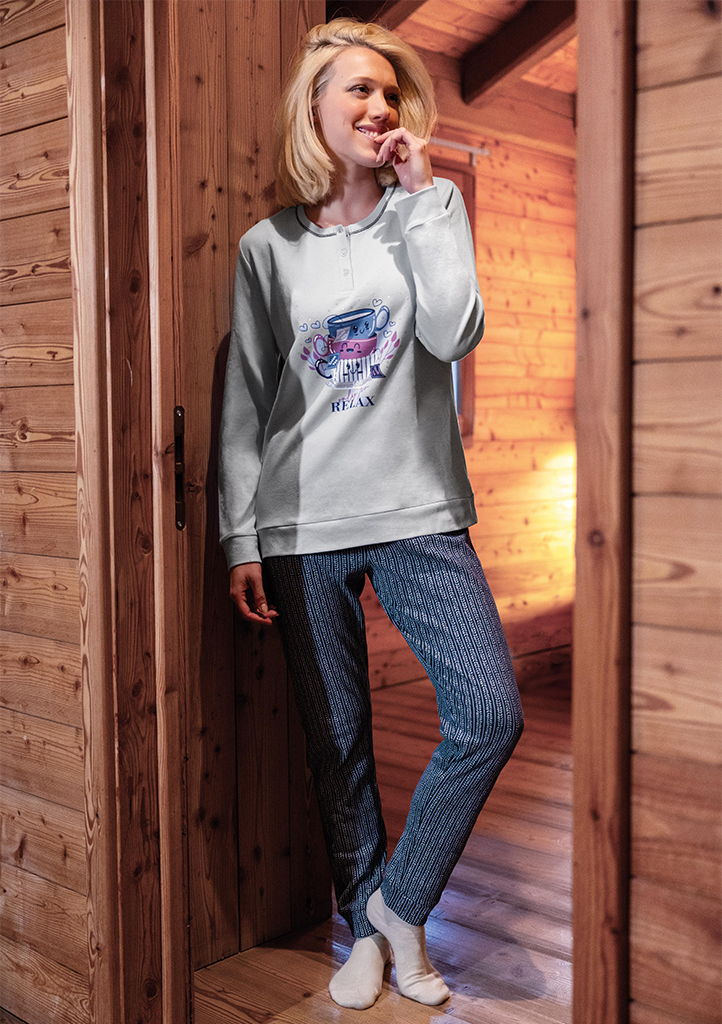 Pohodlné dámské pyžamo Siélei ve světle šedé barvě s nápisem Relax je ideální pro klidné večery i ničím nerušený spánek. Horní díl má kulatý výstřih, zapínání na malé knoflíčky a roztomilý potisk s hrníčkem a srdíčky. Kalhoty jsou světle šedé s tmavě modrými pruhy, mají elastický pas a rovný střih pro maximální pohodlí. Pyžamo je vyrobeno z měkké, prodyšné bavlny příjemné na dotek a je baleno v elegantní dárkové krabičce.