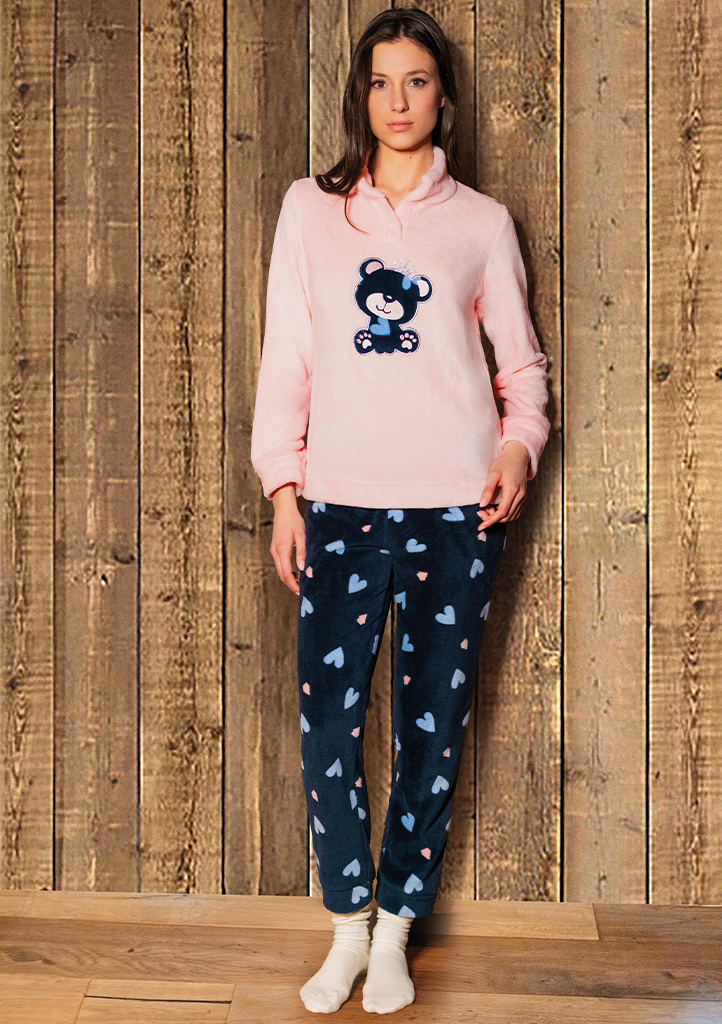 Dámské pyžamo Siélei z hebkého, hřejivého materiálu, který je ideální na chladné zimní večery. Mikina v jemné růžové barvě má roztomilý motiv medvídka a pohodlný stojáček. Kalhoty jsou tmavě modré s potiskem srdíček, v pase na gumu pro maximální komfort. Pyžamo působí hravě a přitom velmi příjemně na nošení – perfektní volba pro domácí pohodu i klidný spánek. Balené v elegantní dárkové krabičce.
