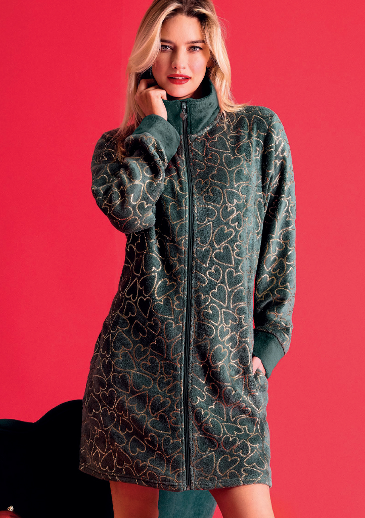 Dámský hřejivý župan Infiore v elegantní tmavě zelené barvě působí luxusně a zároveň útulně. Je vyroben z měkkého fleecového materiálu, který skvěle zahřívá a je velmi příjemný na nošení. Celoplošný vzor zlatých srdíček dodává županu romantický a moderní vzhled. Praktický zip po celé délce, vysoký stojáček a pohodlné kapsy zajišťují maximální komfort. Ideální volba pro zimní večery i domácí pohodu.Materiálové složení: 100% polyester.