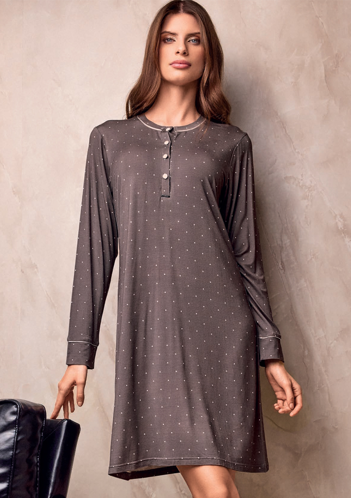 Elegantní noční košile Lormar v tlumeném hnědo-šedém odstínu působí jemně a nadčasově. Drobný puntíkovaný vzor dodává košili lehkost a ženskost, zatímco jednoduchý střih s dlouhými rukávy zajišťuje maximální pohodlí při nošení. Výstřih je ozdoben légou s kontrastními knoflíčky, které celý model krásně zvýrazní. Měkký, příjemný materiál splývá po těle a vytváří pocit komfortu po celou noc. Ideální volba pro ženy, které preferují decentní, ale elegantní styl.Materiálové složení: 95% viskóza, 5% elastan.