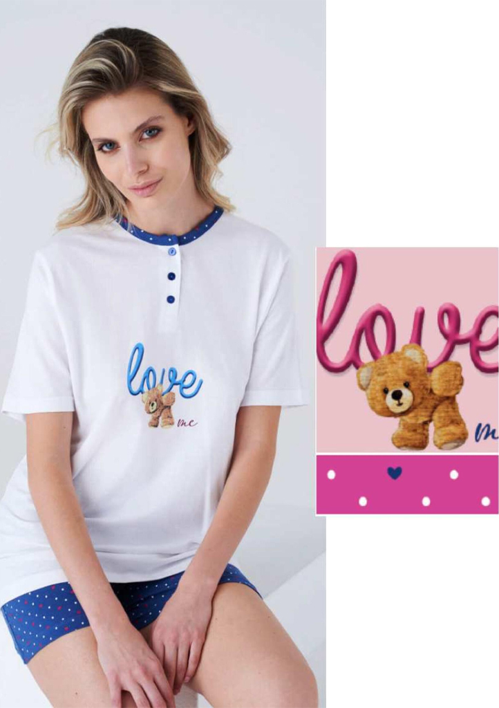 Dámské pyžamo značky KarelPiu v jemném a hravém designu, které spojuje pohodlí a ženský styl. Tričko s krátkým rukávem je vyrobené z příjemného, měkkého materiálu a zdobené roztomilým motivem medvídka s nápisem „love me“. Kulatý výstřih s drobnými knoflíčky dodává modelu elegantní detail. Krátké kalhoty s drobným vzorem perfektně ladí s horním dílem a zajišťují komfort při spánku i domácím odpočinku. Pyžamo je ideální volbou pro teplejší noci a potěší všechny, které mají rády pohodlné, ale zároveň hezké noční prádlo. Dostupné v bílo-modré a světle růžové variantě.Materiálové složení: 100% bavlna.