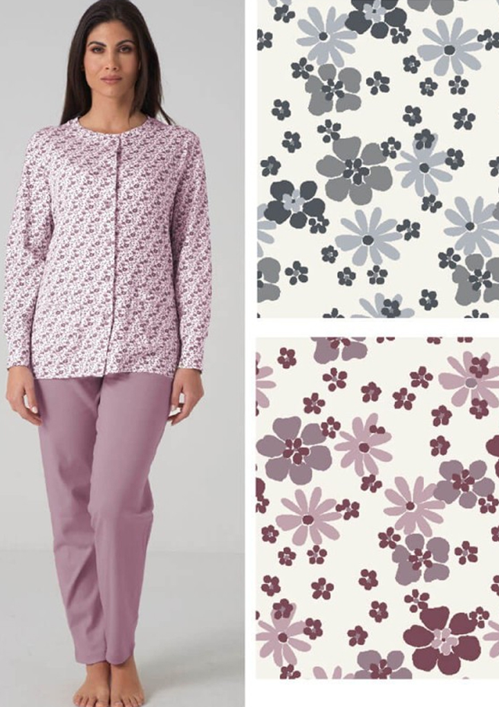 Dámské pyžamo KarelPiu zaujme jemným květinovým vzorem v elegantních, tlumených tónech a pohodlným střihem vhodným pro každodenní nošení i odpočinek. Horní díl s dlouhým rukávem má klasický zapínací vzhled a je vyroben z příjemného, měkkého materiálu, který je šetrný k pokožce a zajišťuje komfort po celou noc. Jednobarevné dlouhé kalhoty v harmonickém odstínu pyžamo krásně doplňují a vytvářejí sladěný celek. Ideální volba pro ženy, které hledají kombinaci pohodlí, kvality a nadčasového designu od značky KarelPiu. Pyžamo je dostupné v šedé a růžové barvě.Materiálové složení: 100% bavlna.