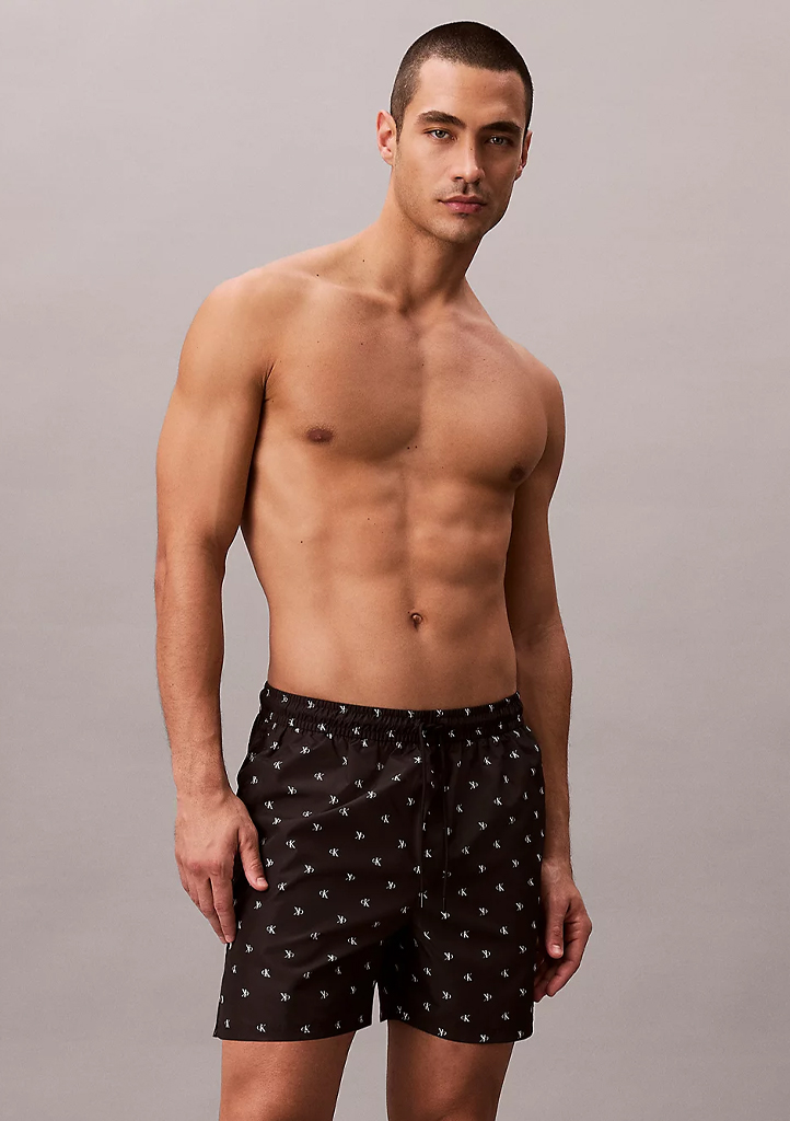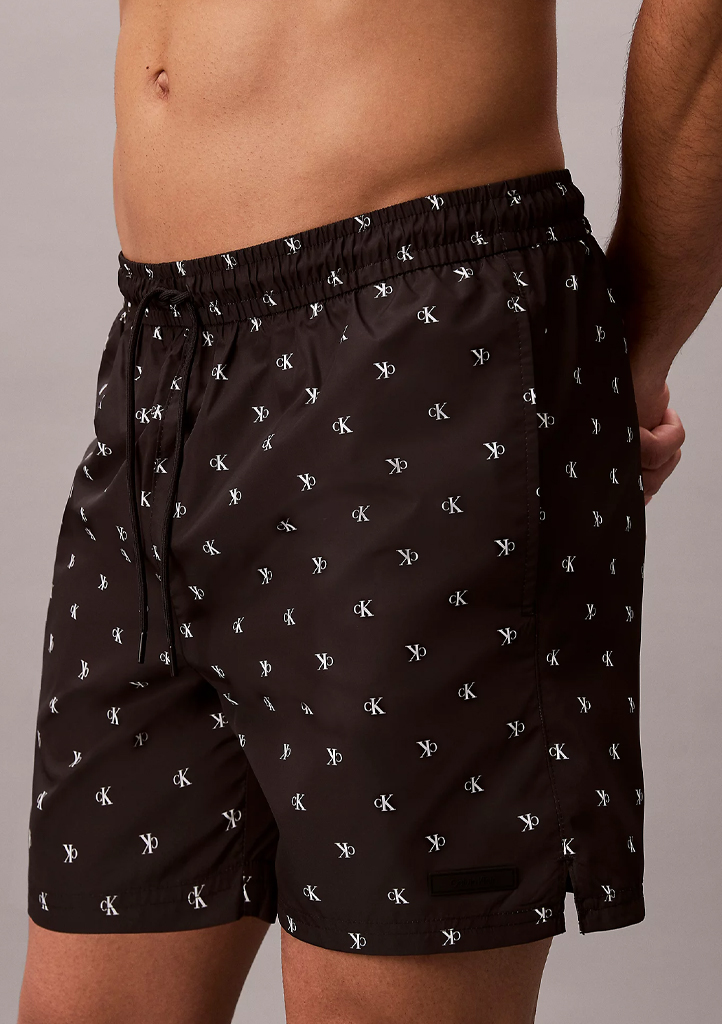 Pánské koupací šortky značky Calvin Klein v černé barvě s jemným celoplošným potiskem loga mají moderní a nadčasový vzhled. Lehký a rychleschnoucí materiál zajišťuje pohodlí při plavání i běžném nošení u vody. Elastický pas se stahovací šňůrkou umožňuje snadné přizpůsobení postavě. Klasický rovný střih doplňují boční kapsy a zadní kapsa. Stylové plavky ideální k moři i k bazénu pro muže kteří preferují čistý design a ikonický styl Calvin Klein.Materiálové složení: 100% polyester.