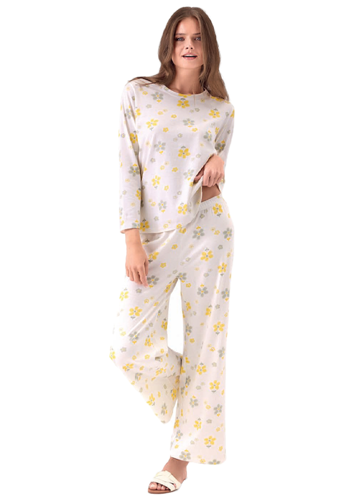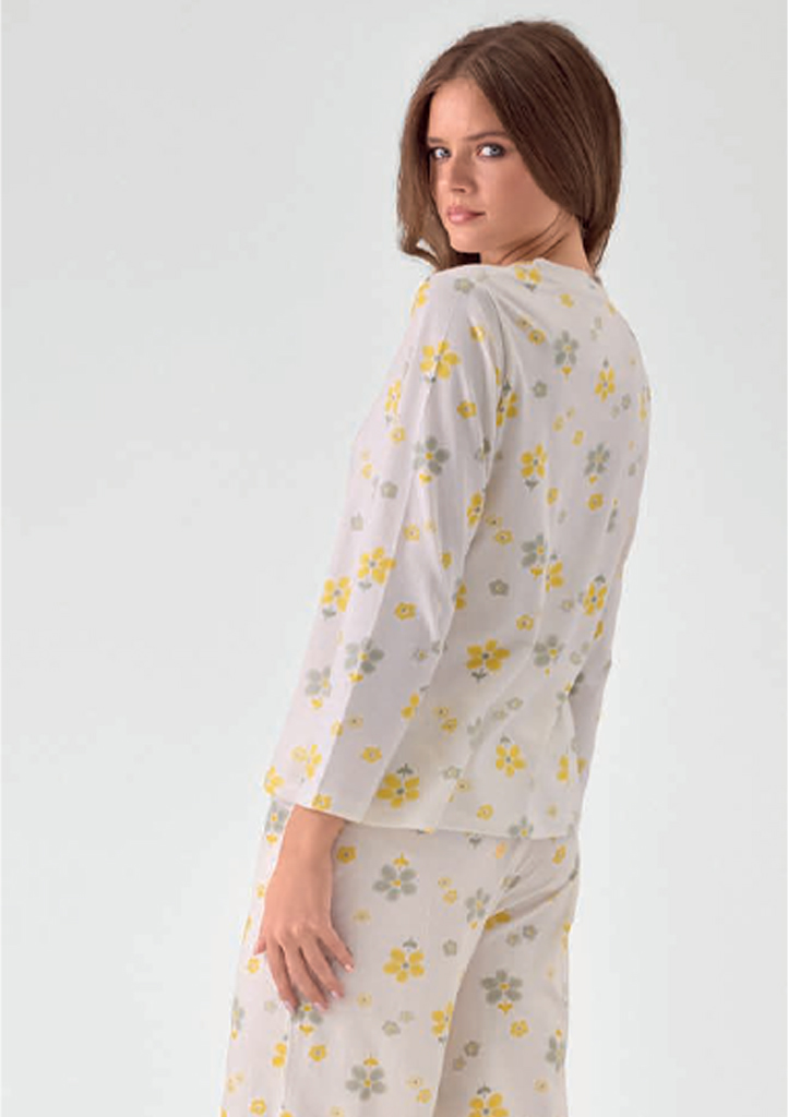 Dámské pyžamo značky Infiore v jemném krémovém odstínu s drobným květinovým potiskem působí lehce a velmi žensky. Horní díl s dlouhým rukávem má jednoduchý kulatý výstřih a pohodlný volnější střih který je ideální pro spánek i domácí relax. Kalhoty s rovnými nohavicemi krásně splývají a zajišťují maximální komfort při nošení. Příjemný měkký materiál je hebký na dotek a vhodný pro celoroční použití. Pohodlné a stylové pyžamo ideální pro ženy které dávají přednost jemnému designu a komfortu.Materiálové složení: 100% bavlna.