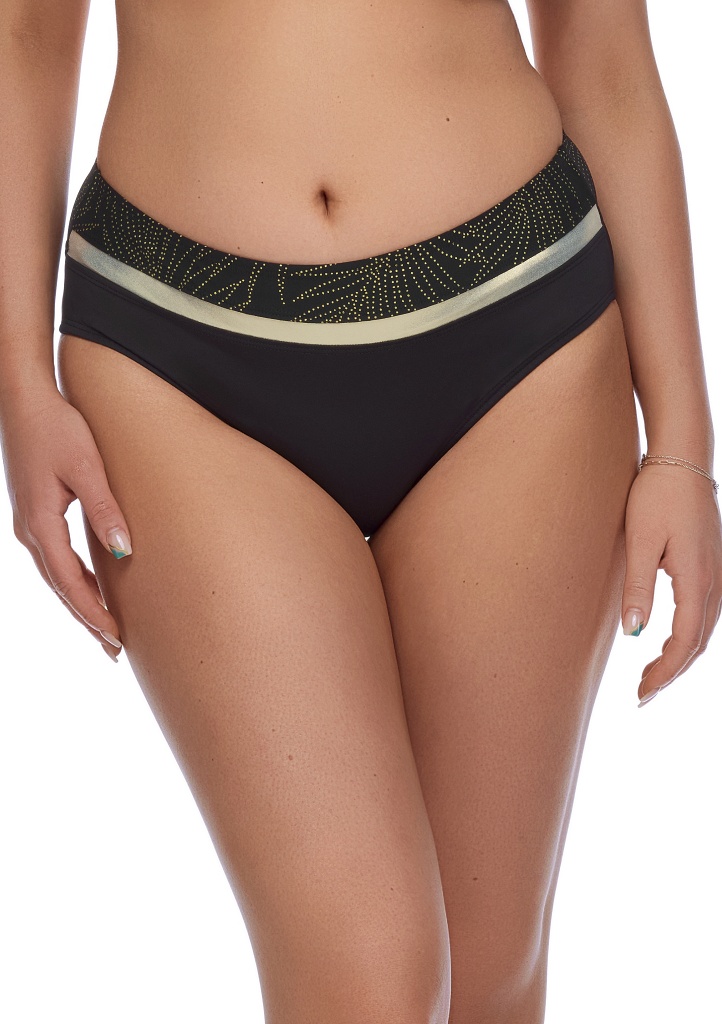 Dámské plavky Fantasy 2026 z nové kolekce Elegant New. Tento model v elegantní černé barvě je klasického střihu a po obvodu má všitý vyšší vzorovaný a zlatý lem. U větších velikostí se snižuje výkroj nohaviček. U těchto plavek lze libovolně kombinovat spodní a horní díl v řádu zadaných velikostí jednotlivých dílů. Plavky jsou české výroby a koupí tohoto výrobku podpoříte produkci českého oděvního průmyslu.