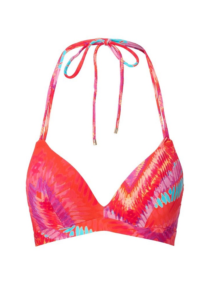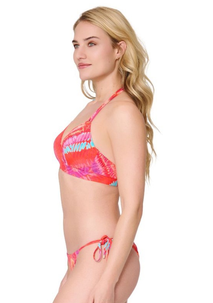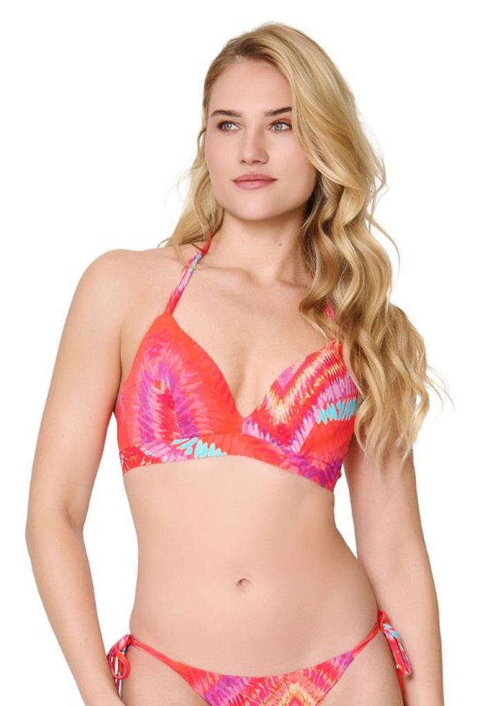 Dámské plavky LingaDore přinášejí sluneční energii a výrazný design, který je ideální pro dovolenou u moře nebo den u bazénu. Tento model je navržen tak, aby kombinoval komfort, podporu a moderní vzhled v jednom. Vyztužený trojúhelníkový vrchní díl s kosticemi pro optimální oporu a tvar poprsí. Šňůrky se zlatým kovovým zakončením se zavazují za krkem a obvod se zapíná vzadu. Materiál je z pružné směsi polyamidu a elastanu, který je příjemný na tělo, dobře sedí a rychle schne.