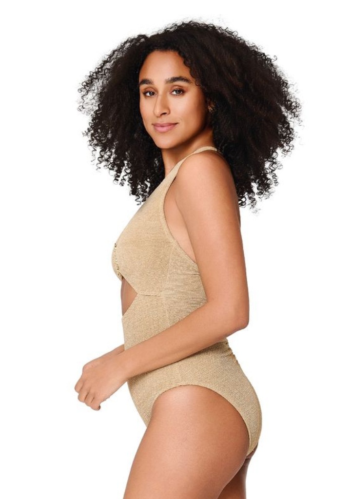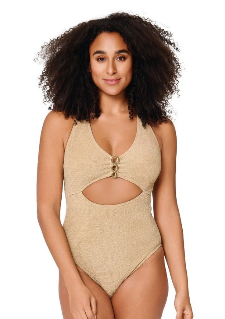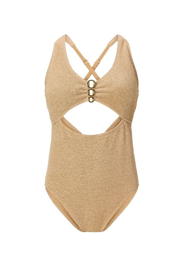 Objevte dokonalou kombinaci elegance, pohodlí a perfektního střihu s dámskými plavkami LingaDore. Podprsenka je bezkosticová, lehce vyztužená. Ramínka jsou délkově polohovatelná a jsou odepínatelná. Tento model je navržen tak, aby lichotil ženské postavě, poskytl oporu a zároveň vám dodal sebevědomí na pláži i u bazénu. Plavky mají lichotivý střih, která zvýrazní siluetu. Plavky jsou ušity z rychleschnoucího materiálu. Uprostřed košíčků je zlatá kovová ozdoba.