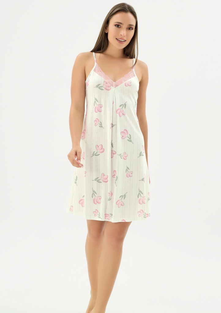 Dámská noční košilka z viskózy na tenká ramínka je ideální volbou pro pohodlný a příjemný spánek. Lehký a měkký materiál se jemně přizpůsobí postavě a zajišťuje maximální komfort během noci. Volnější výstřih do V je ozdoben elegantní krajkou, která dodává košilce něžný a romantický vzhled. Tenká ramínka dodávají modelu jemnost a lehkost, což z ní činí ideální kousek pro relaxaci a domácí pohodu.