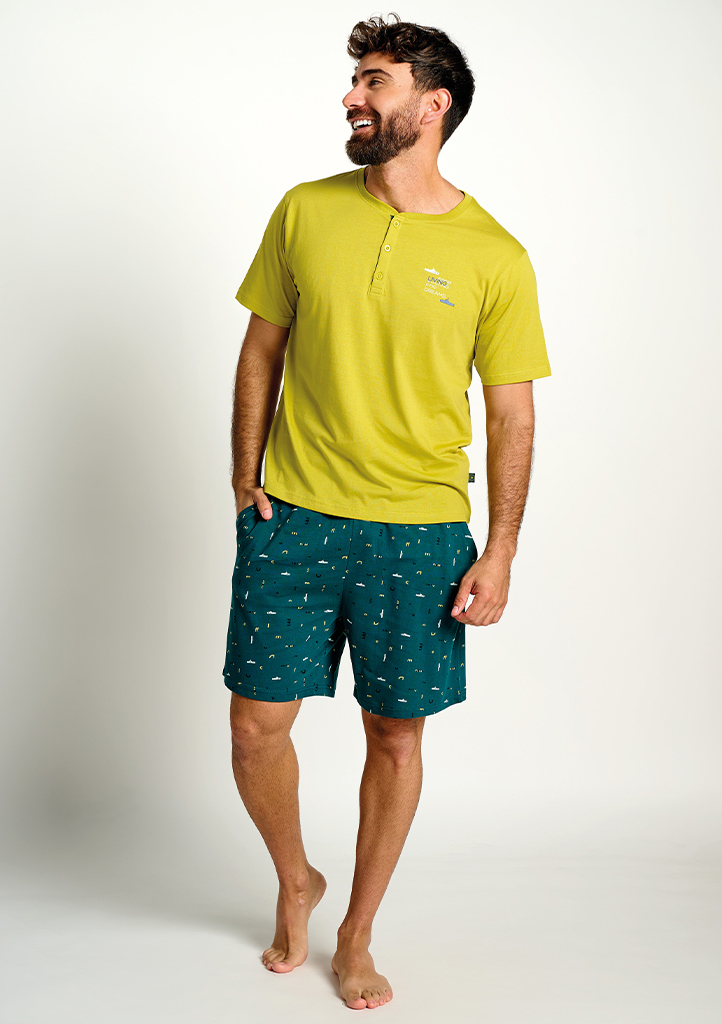 Pánské pyžamo značky Muydemi v moderním a svěžím designu tvoří pohodlné tričko s krátkým rukávem ve výrazném žlutozeleném odstínu doplněné o kraťasy v tmavě zelené barvě s jemným potiskem. Tričko má kulatý výstřih s krátkou légou na knoflíčky, působí ležérně a zároveň stylově. Kraťasy mají pohodlný střih, elastický pas a jsou ideální pro maximální komfort při spánku i domácím nošení. Příjemný a lehký materiál zajišťuje pohodlí během teplejších nocí, zatímco moderní barevná kombinace dodává celému setu atraktivní vzhled.Materiálové složení: 100% bavlna