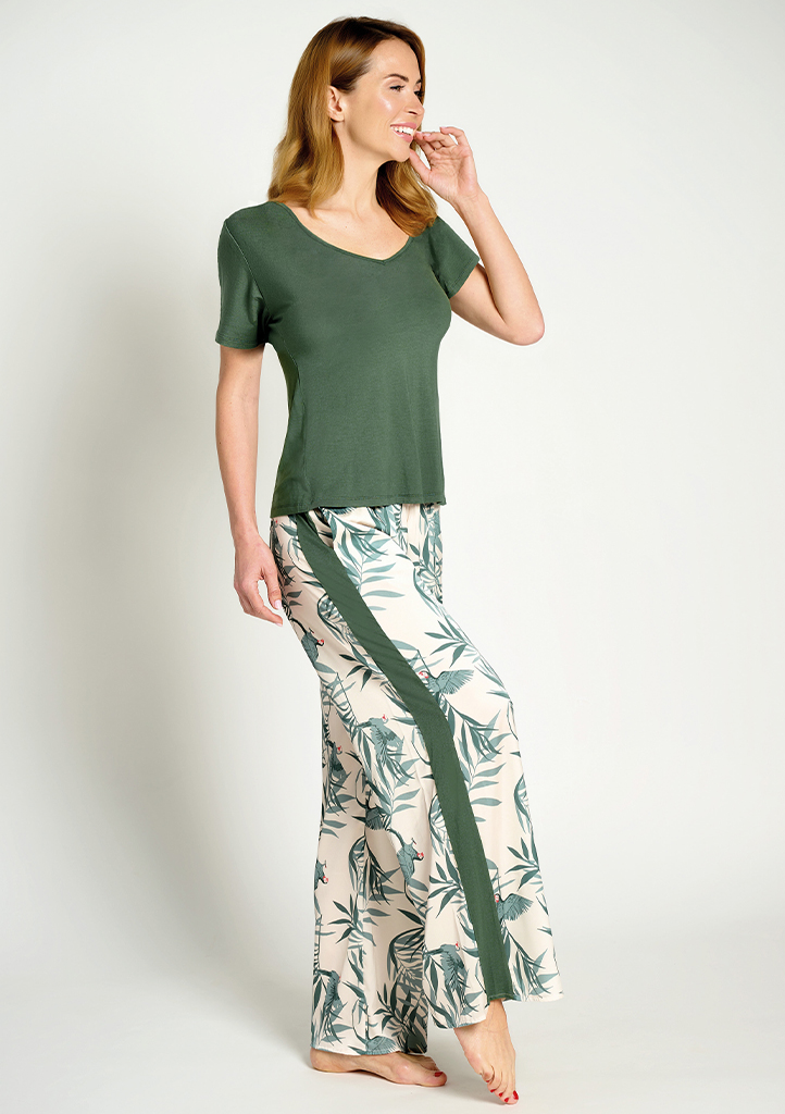 Dámské pyžamo značky Muydemi v elegantním a pohodlném provedení tvoří tričko s krátkým rukávem v tmavě zelené barvě doplněné o dlouhé kalhoty s jemným přírodním motivem. Tričko má kulatý výstřih a volnější střih, který zajišťuje maximální komfort při nošení. Kalhoty mají pohodlný střih, elastický pas a jsou zdobeny decentním vzorem listů a ptáků v přírodních tónech, doplněným o kontrastní boční pruh, který opticky prodlužuje postavu. Lehký a příjemný materiál je ideální pro klidný spánek i domácí relaxaci a zároveň dodává modelu stylový vzhled.Materiálové složení: horní díl: 95% viskóza, 5% elastan – spodní díl: 95% polyester, 5% elastan