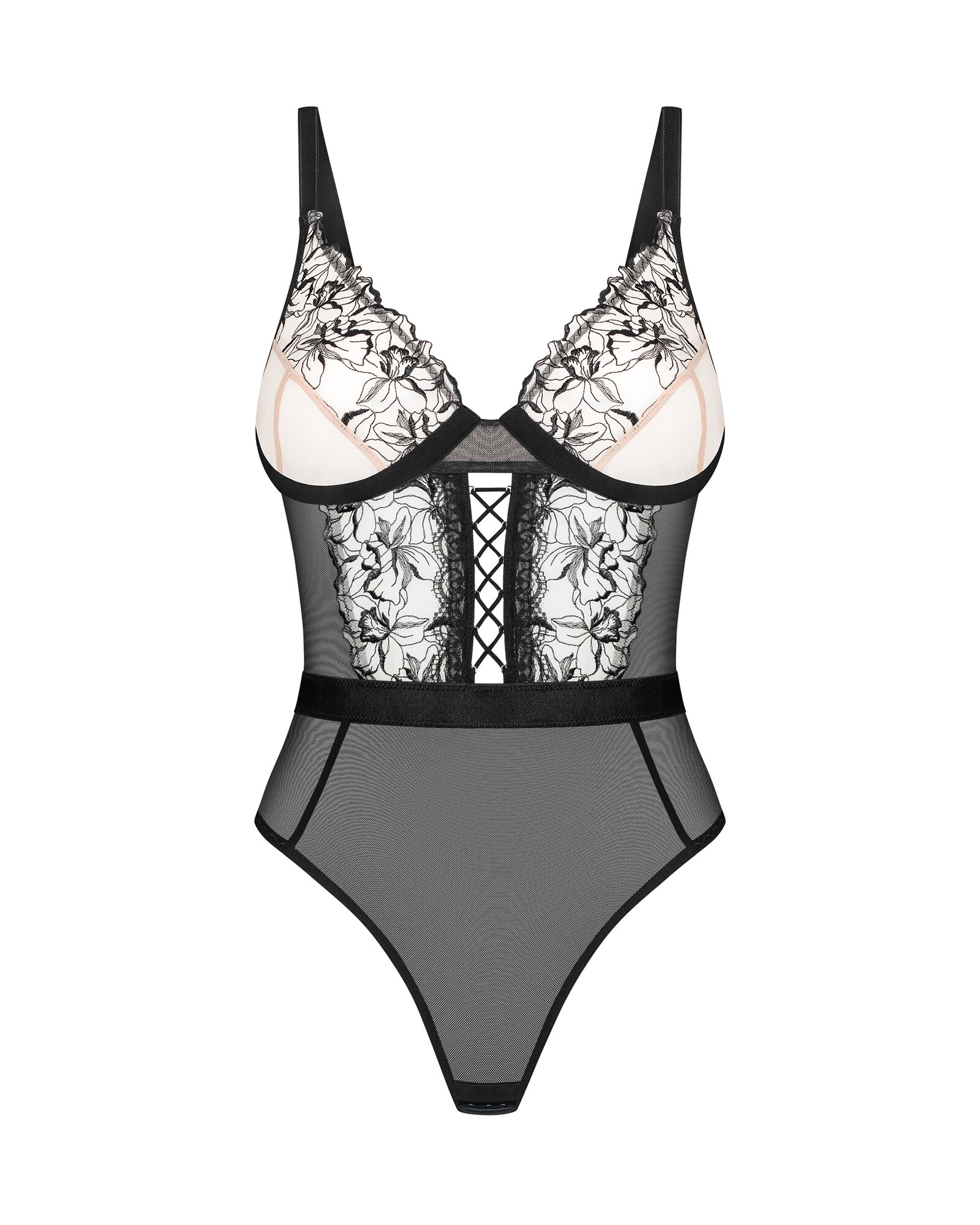 Kombinace luxusních materiálů a květinové fantazie. Body s kosticemi pro dokonalou oporu a šněrováním vpředu. Vytváří neodolatelnou siluetu díky vysokému střihu v oblasti boků, zatímco široký pás zvýrazňuje pas a výřez na zádech nabízí svůdné náhledy. Možnost nastavení zaručuje dokonalé padnutí. Vyrobeno z průsvitné, pružné síťoviny. Tylové košíčky zdobené jemnou květinovou výšivkou. Kvetoucí elegance a mozaika smyslných textur.teddy s květinovým vzorem