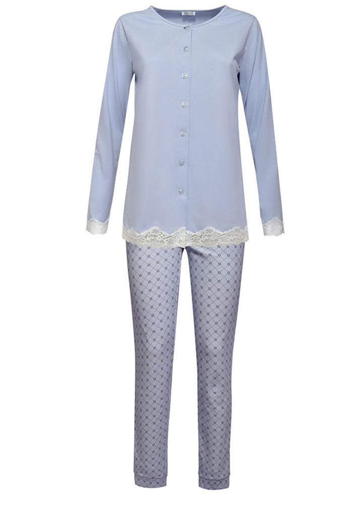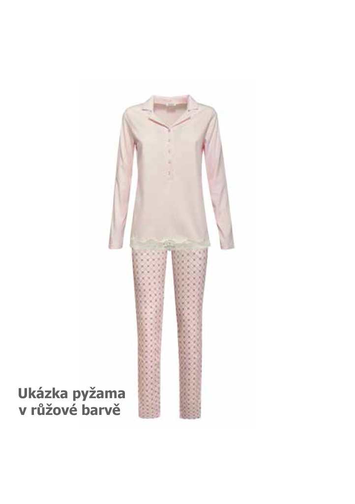 Dámské pyžamo italské značky Siélei. Pyžamo se skládá z celopropínacího kabátku. Rukávy má dlouhé, ukončené pružnou krajkou. Spodní část kabátku je ukončená pružnou krajkou. Okolo krku má kulatý výstřih. Kalhoty jsou volnější, mají zapuštěné kapsy. Nohavice jsou ukončené manžetou. Pás mají do pružné gumy. Vnitřní část je počesaná jemných chloupkem, takže pyžamo krásně hřeje. Je vyrobené z bavlny s označením OEKO-TEX.