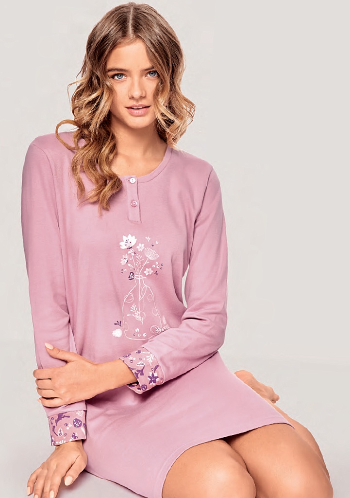 Dámská noční košile italské značky Infiore. Košile má kulatý výstřih a légu se dvěma knoflíky. Na přední straně je natištěná a vyšitá aplikace. Rukávy jsou ukončené do volné manžety. Košile je ušitá z příjemné a hřejivé bavlny.