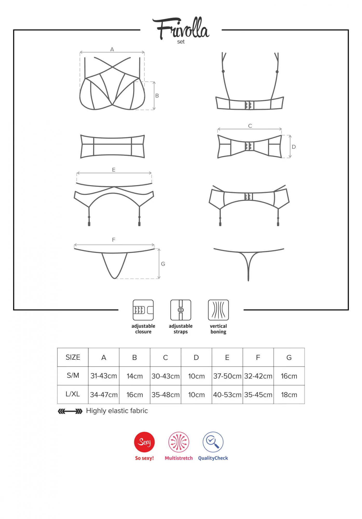 Frivolla setNeuvěřitelně nádherný a svůdný set. Pokryje vaše tělo dokonale jemnou krajkou s hravými proužky – od krku až po hýždě. Seznamte se s Frivolla setem! Čtyři obdivuhodné kousky prádla k vám přichází se svým zvláštním kouzlem. Naprosto jedinečný design s koketní krajkou a pásky vám umožní stát se sexy svůdnicí. Takže? Stačí jen obléci a prožít ty vzrušující chvíle, které na vás čekají!