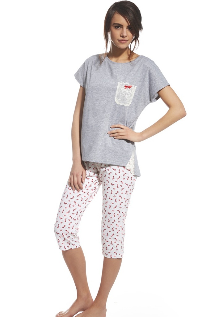 Pohodlné bavlněné dámské pyžamo s krátkým rukávem od značky Cornette. Vrchní díl má na přední straně krajkovou kapsičku s červenou mašlí. Kalhoty jsou 3/4 s potiskem.