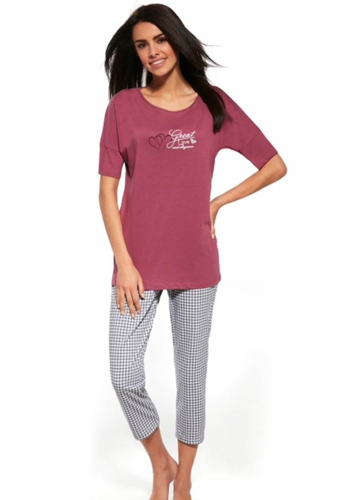 Dámské pyžamo, které je vyrobené z velmi kvalitní látky. Blůza pyžama má krátké rukávy a její přední díl zdobí barevný nápis. Kárované kalhoty mají 7/8 délku. Pyžamo je zabalené v krabičce.
