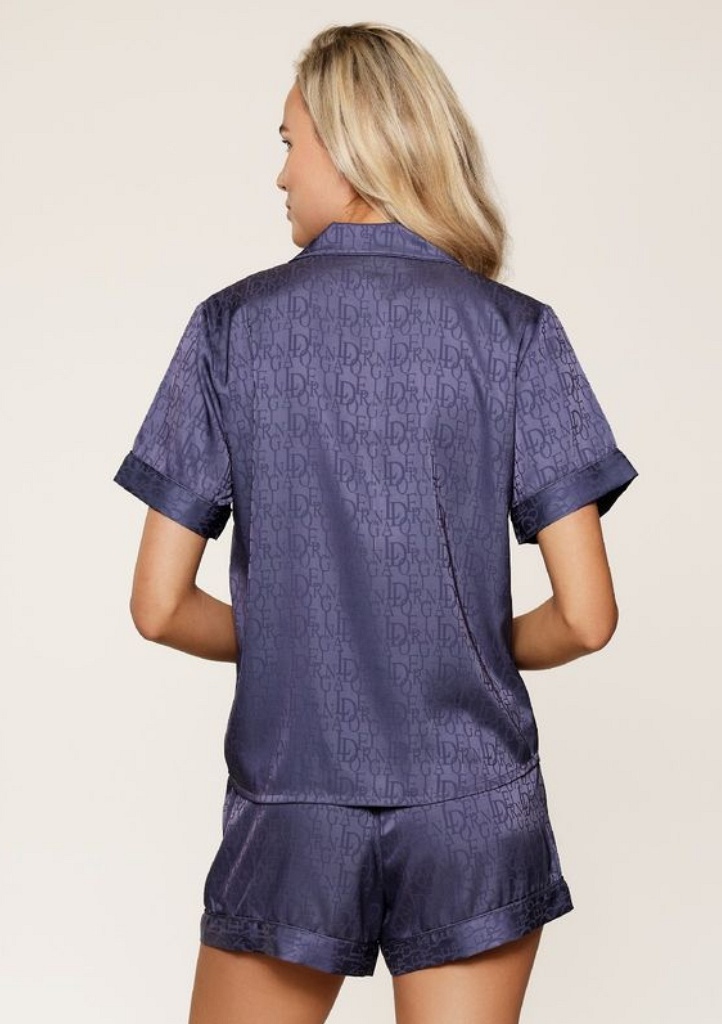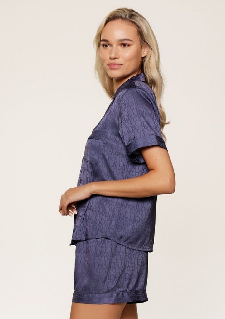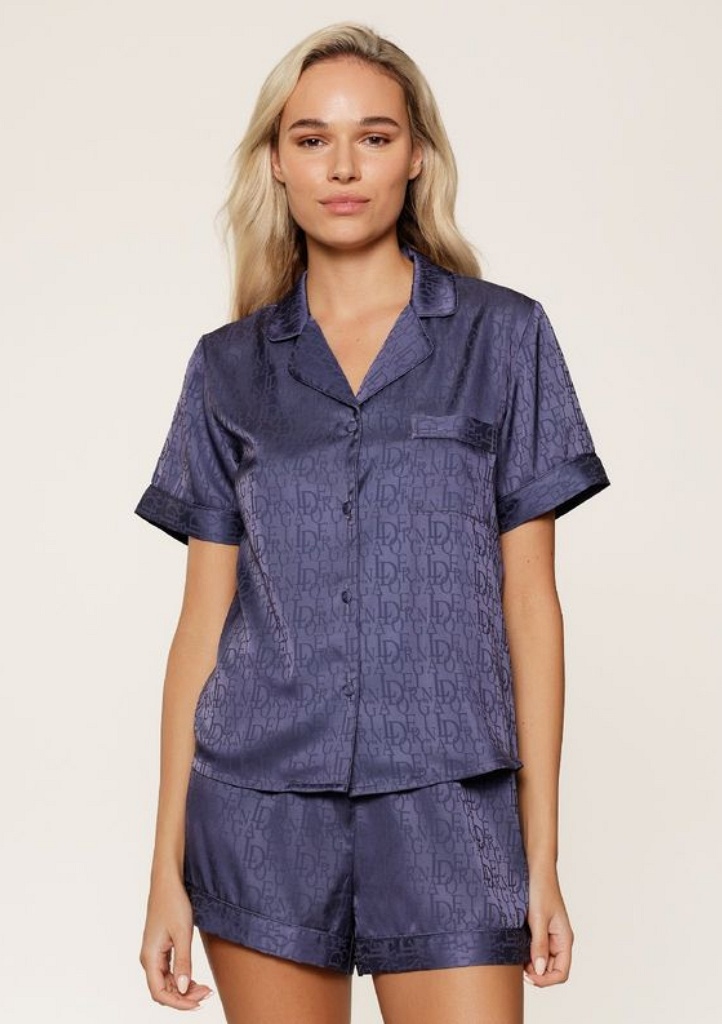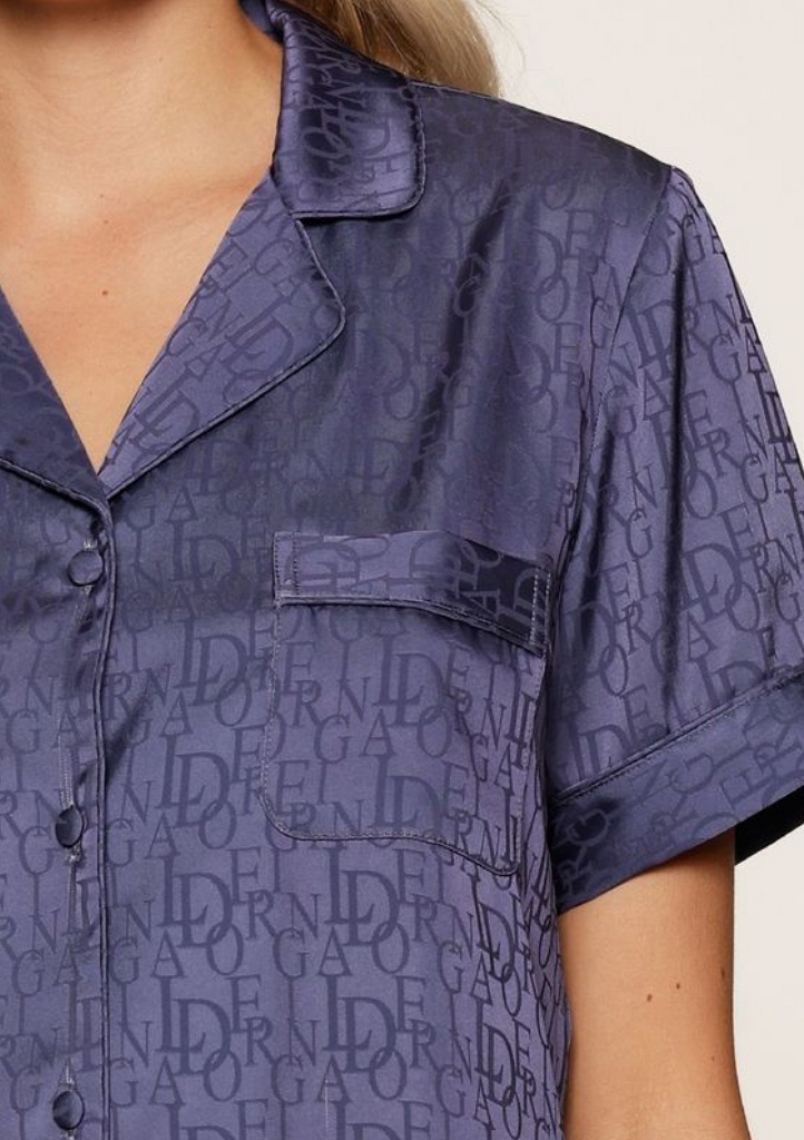 Dámská luxusní pyžamová sada složená z krátkých kalhot a halenky s krátkým rukávem, vyrobená z jemného saténového materiálu, který působí hedvábně na dotek a zajišťuje pohodlí při nošení. Halenka má zapínání na knoflíky po celé délce a na přední straně náprsní kapsičku. Kalhoty disponují elastickým pasem pro pohodlné nošení a rovnými nohavicemi pro elegantní vzhled. Po celé ploše pyžama je tištěné logo „LD“ v tónu barvy pyžama.