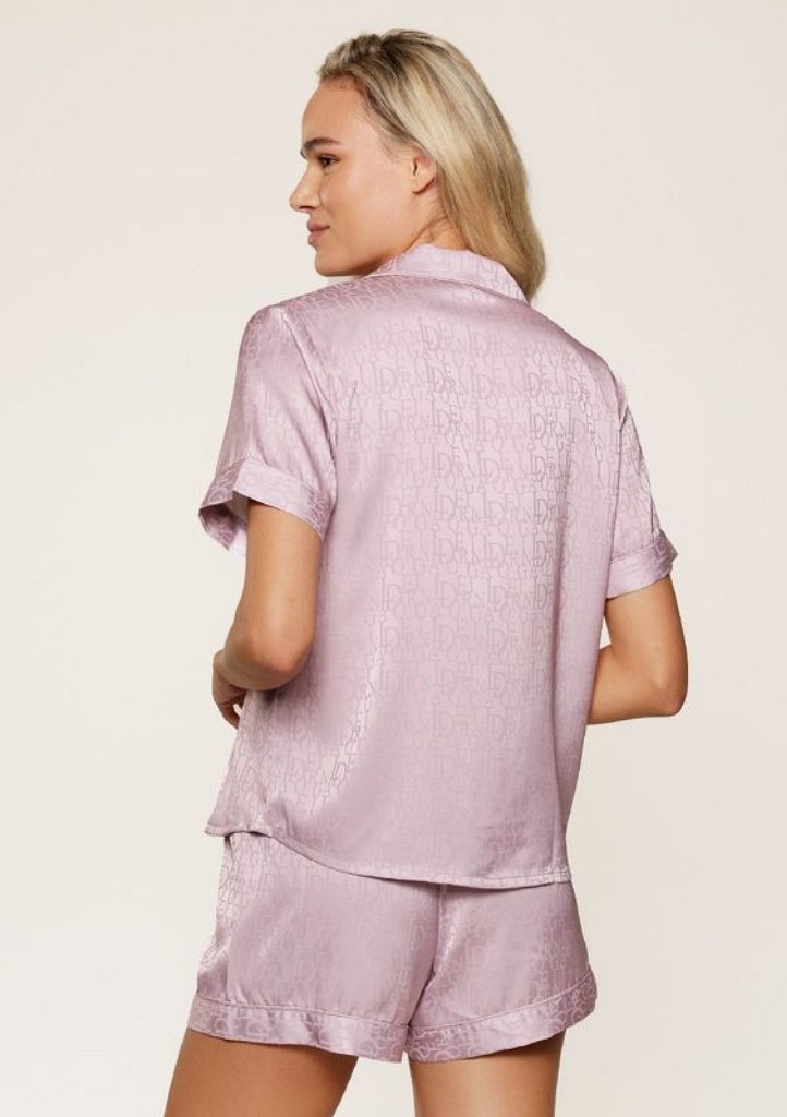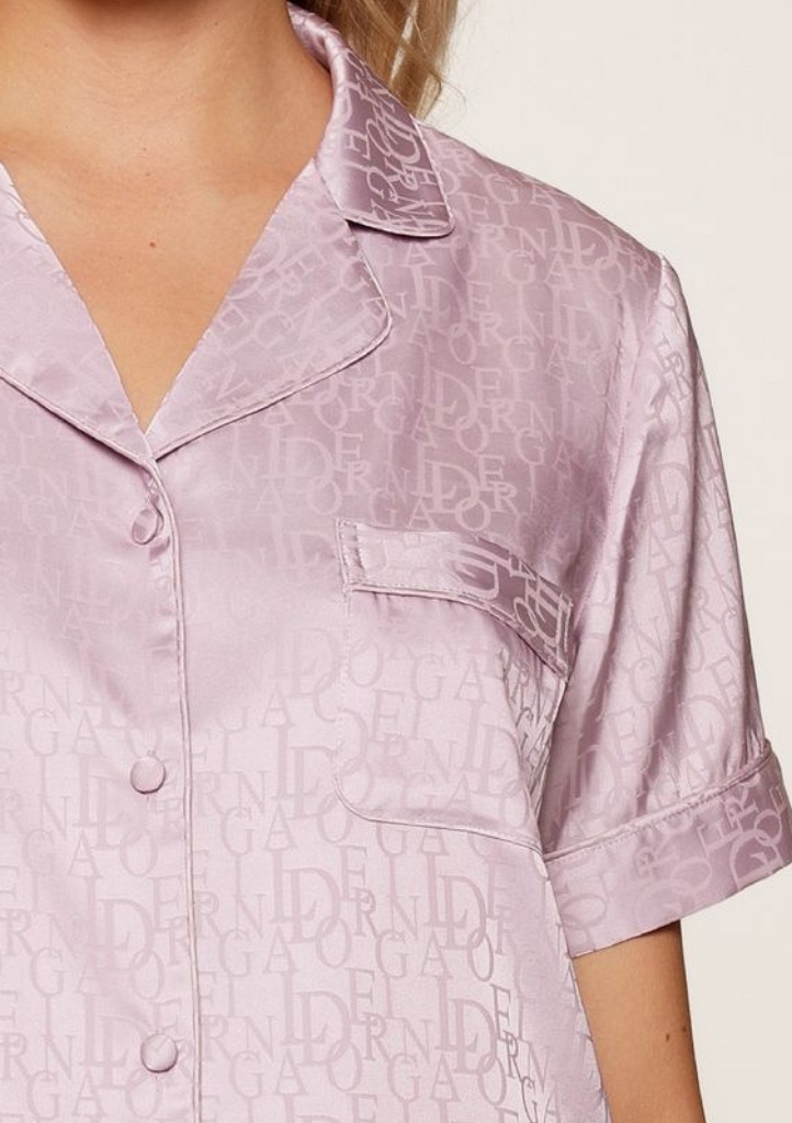 Dámská luxusní pyžamová sada složená z krátkých kalhot a halenky s krátkým rukávem, vyrobená z jemného saténového materiálu, který působí hedvábně na dotek a zajišťuje pohodlí při nošení. Halenka má zapínání na knoflíky po celé délce a na přední straně náprsní kapsičku. Kalhoty disponují elastickým pasem pro pohodlné nošení a rovnými nohavicemi pro elegantní vzhled. Po celé ploše pyžama je tištěné logo „LD“ v tónu barvy pyžama.