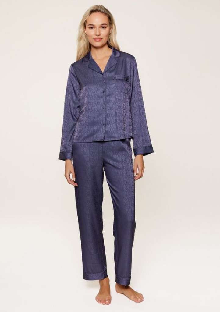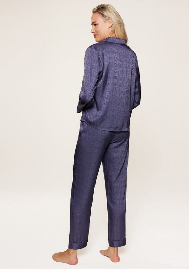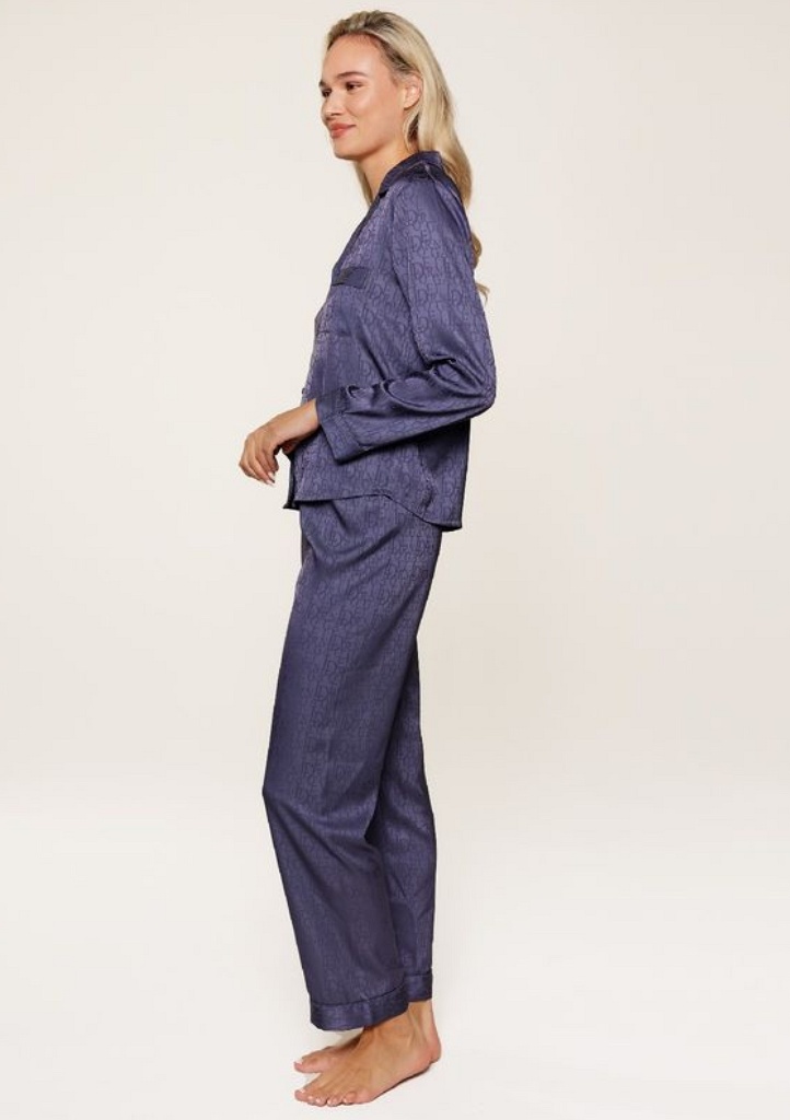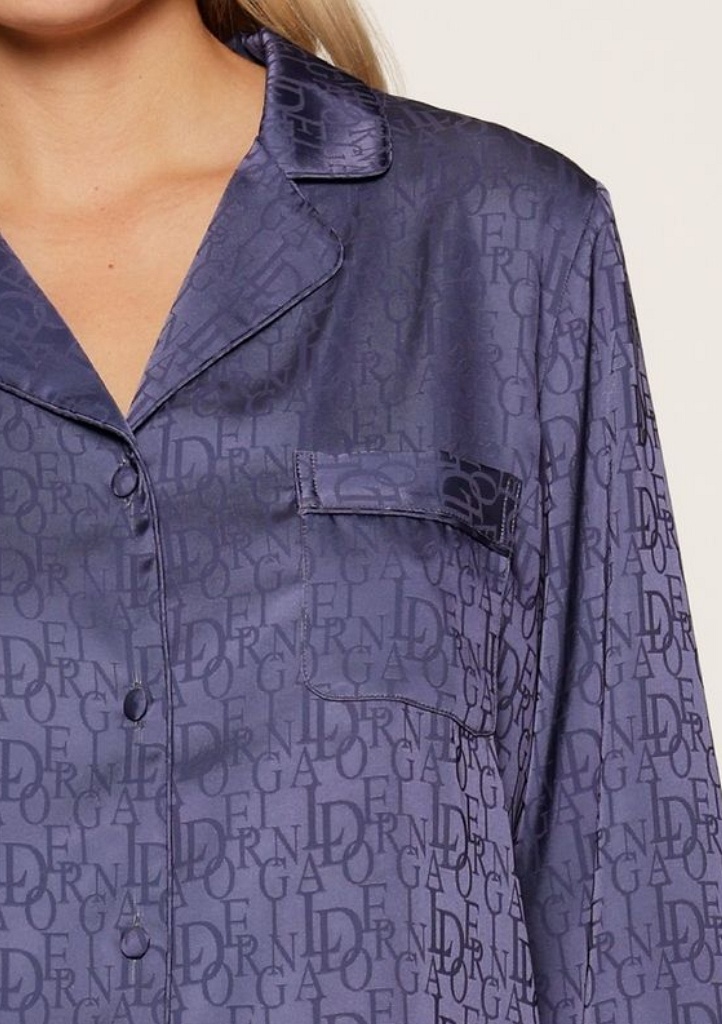 Dámská luxusní pyžamová sada složená z dlouhých kalhot a halenky s dlouhým rukávem, vyrobená z jemného saténového materiálu, který působí hedvábně na dotek a zajišťuje pohodlí při nošení. Halenka má zapínání na knoflíky po celé délce a na přední straně náprsní kapsičku. Kalhoty disponují elastickým pasem pro pohodlné nošení a rovnými nohavicemi pro elegantní vzhled. Po celé ploše pyžama je tištěné logo „LD“ v tónu barvy pyžama.
