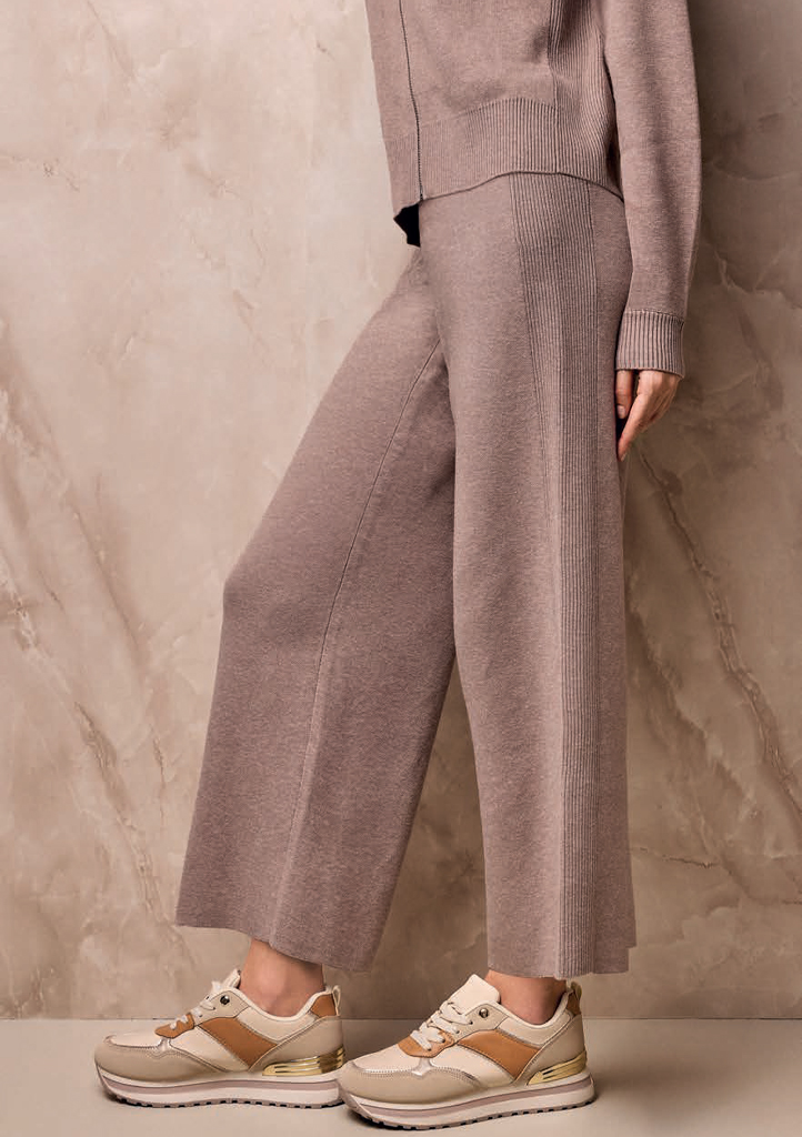 Stylová pletená souprava z jemného úpletu v barvě nocciola (lískový oříšek) je ideální pro pohodlné dny doma i volnočasové nošení venku. Mikina má praktickou kapuci a zip po celé délce, kalhoty jsou volného střihu s pružným pasem a žebrovanými detaily po stranách. Celek působí elegantně a zároveň uvolněně – perfektní kombinace komfortu a stylu. Skvělý outfit pro chladnější dny, který můžete nosit jako komplet nebo samostatně.
