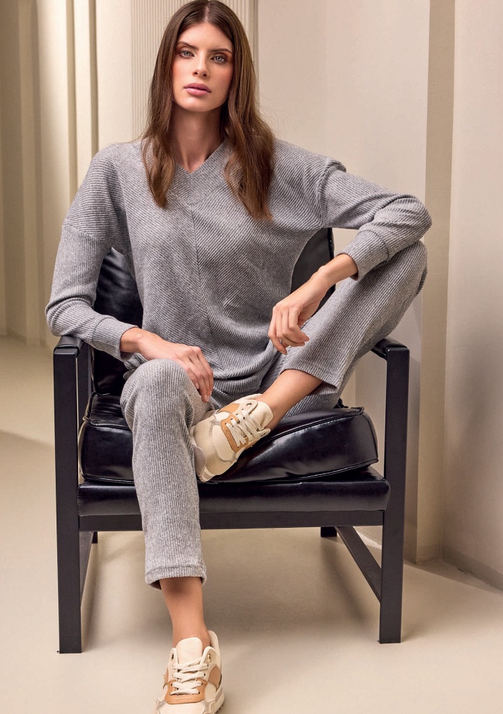 Dámská souprava italské značky Lormar. Souprava se skládá z trička s dlouhým rukávem a výstřihem do "V". Rukávy jsou ukončené lemem. Kalhoty jsou volnější, s volným ukončením nohavic, pas je do pružné obšité gumy. Materiál je žebrovaný a pružný. Na dotek připomíná materiál "Mohair".