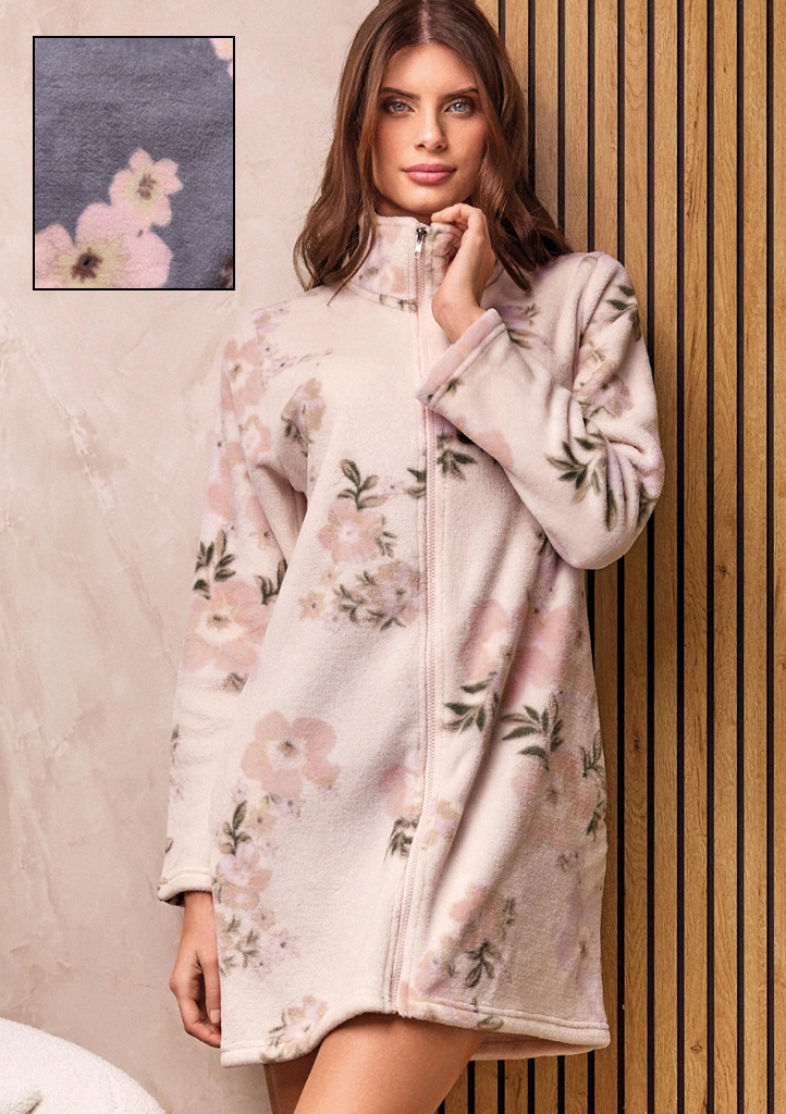 Dámský župan na zip od značky Lormar je vyrobený z mimořádně hebkého a hřejivého fleecového materiálu, který poskytuje maximální pohodlí při domácím odpočinku. Zapínání na celý zip je velmi praktické a doplněné vyšším stojáčkem, který příjemně zahřeje u krku. Jemný květinový vzor v pastelových tónech dodává županu elegantní a něžný vzhled. Delší pohodlný střih je ideální na každodenní nošení i jako teplá vrstva přes pyžamo.
