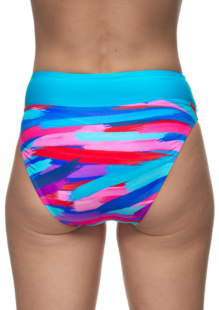 Dámské plavky Fantasy 2026 z nové kolekce Debie. Tento model v pestrobarevném provedení je klasického střihu a po obvodu má všitý vyšší lem ve světle modré barvě. U větších velikostí se snižuje výkroj nohaviček. U těchto plavek lze libovolně kombinovat spodní a horní díl v řádu zadaných velikostí jednotlivých dílů. Plavky jsou české výroby a koupí tohoto výrobku podpoříte produkci českého oděvního průmyslu.