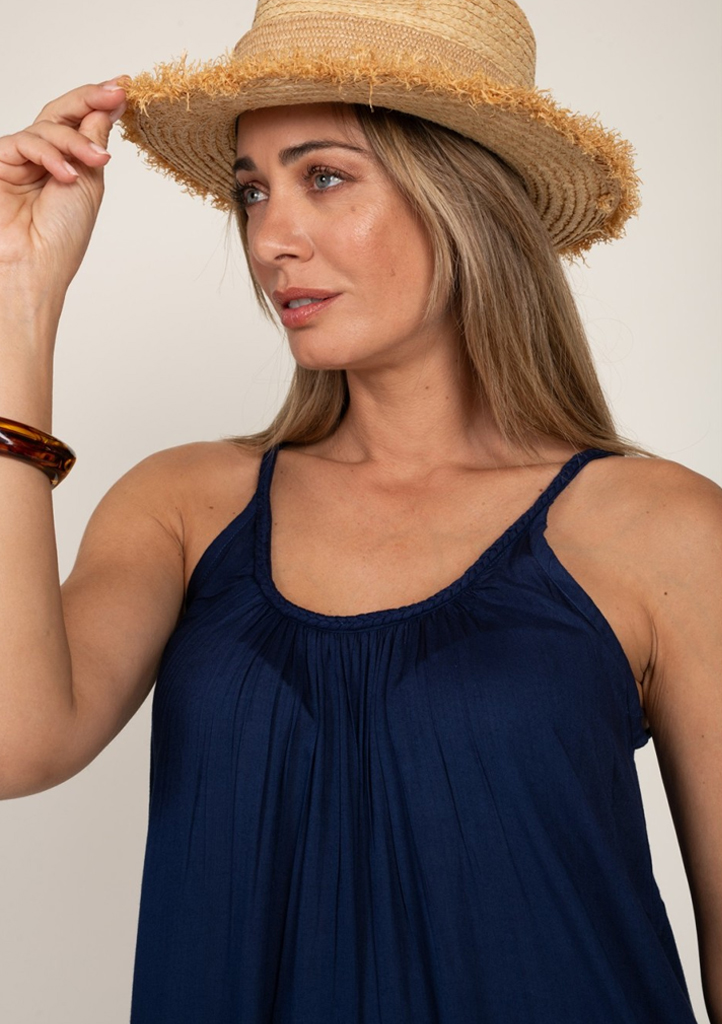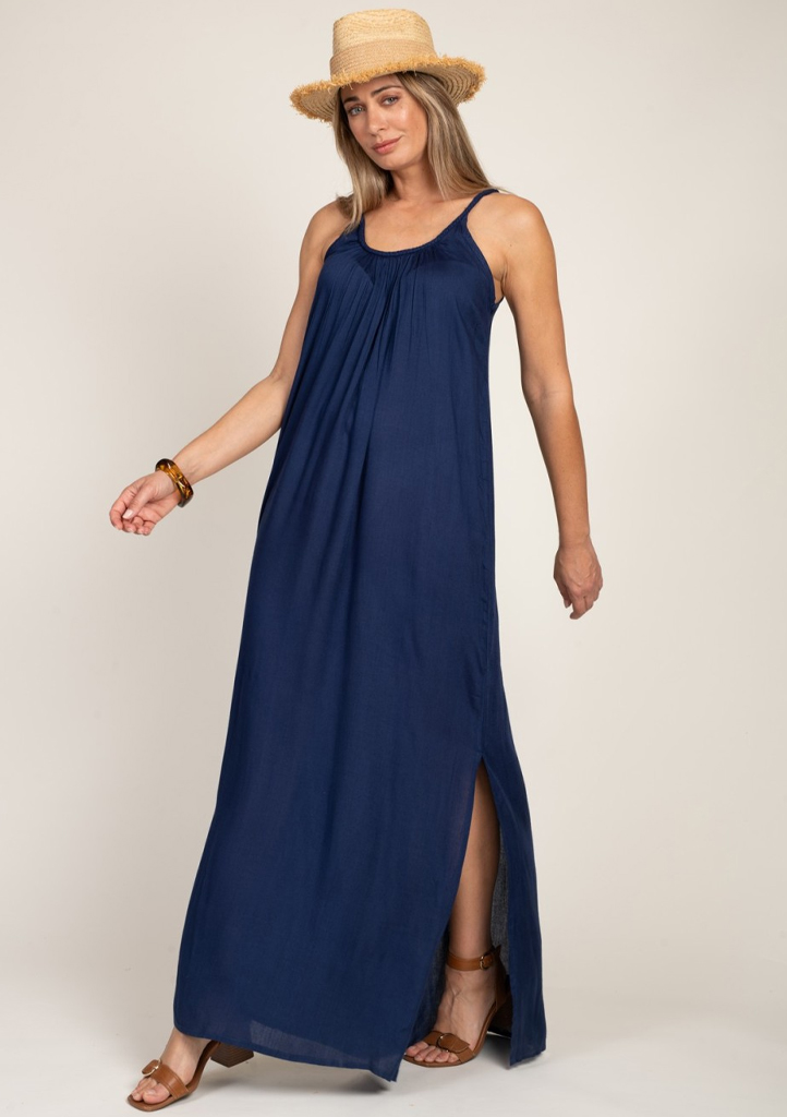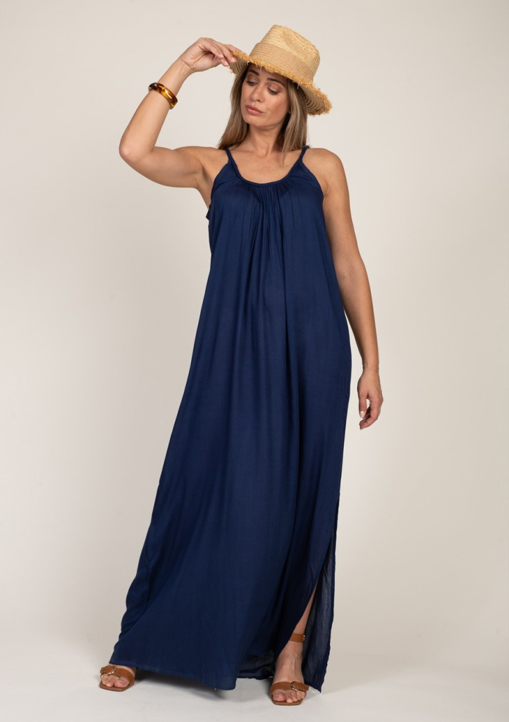 Dlouhé dámské šaty značky Terre Rouge v elegantní tmavě modré barvě jsou perfektní volbou pro letní dny i dovolenou u moře. Lehký a vzdušný materiál krásně splývá a zajišťuje maximální pohodlí i během horkého počasí, zatímco volnější střih lichotí postavě a neomezuje v pohybu. Šaty mají tenká ramínka, jemné řasení v oblasti výstřihu a výrazný boční rozparek, který dodává modelu ženský a lehce smyslný vzhled. Skvěle se kombinují s letními doplňky a sandály, ať už vyrazíte na pláž, procházku městem nebo večerní posezení.Materiálové složení: 100% viskóza