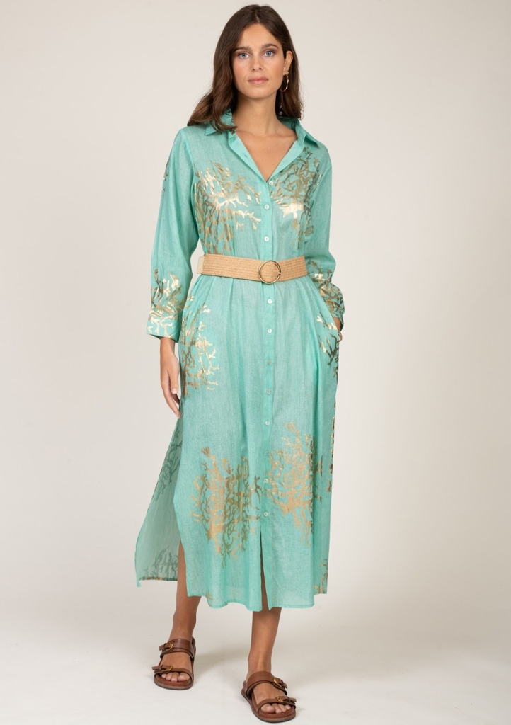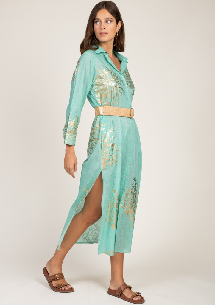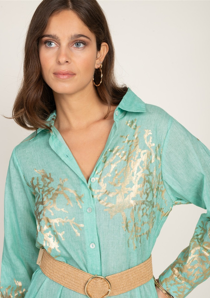 Dlouhé košilové šaty značky Terre Rouge v jemné mentolové barvě s výrazným zlatým potiskem jsou elegantní a zároveň svěží volbou pro letní dny. Lehký, vzdušný materiál příjemně splývá a zajišťuje maximální komfort i v horkém počasí, zatímco volnější střih lichotí postavě a umožňuje volnost pohybu. Šaty mají klasické zapínání na knoflíky po celé délce, límeček, dlouhý rukáv a boční rozparky, které dodávají modelu ženský a lehce smyslný vzhled. Díky pásku krásně zvýrazní siluetu a snadno je sladíte jak s elegantními sandály, tak i ležérními doplňky na dovolenou či do města.Materiálové složení: 100% bavlna