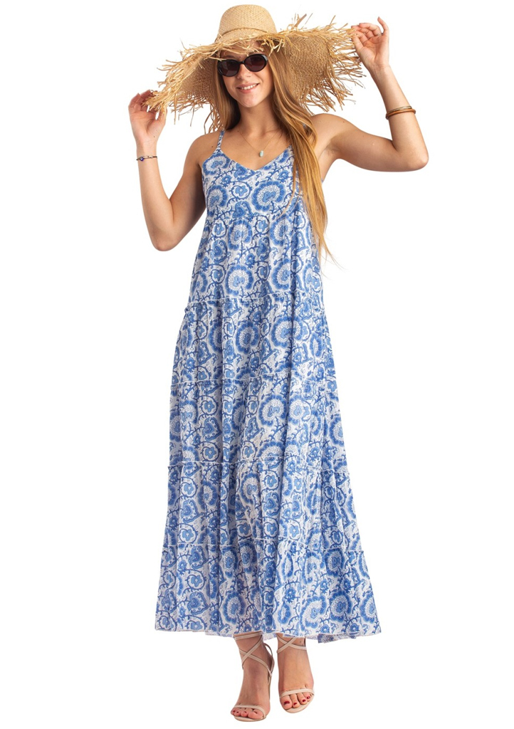 Tyto modro-bílé maxi šaty od francouzské značky Terre Rouge jsou jako stvořené pro slunečné dny u moře i ve městě. Lehký materiál příjemně splývá, volný áčkový střih poskytuje maximální pohodlí a tenká nastavitelná ramínka zajišťují ideální přizpůsobení. Romantický květinový vzor v azurových tónech působí svěže a nadčasově. Noste je s kloboukem a sandálky pro dokonalý letní look.