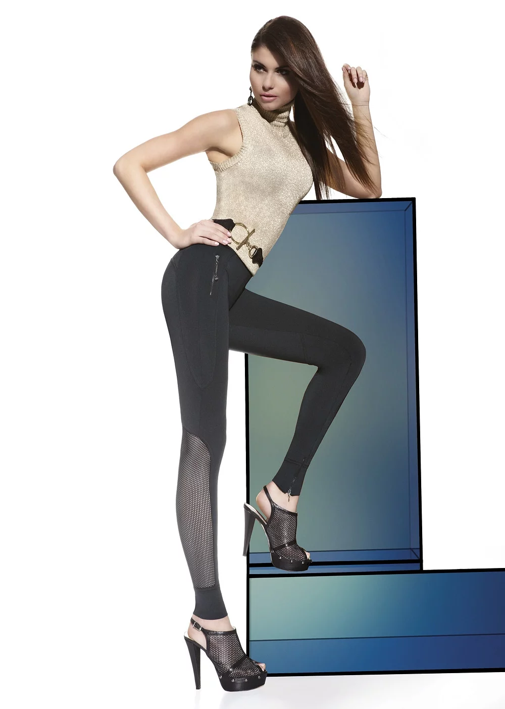 Legíny Bas Bleu Holly mají od kolen dolů všitou síťovinu, která dodává legínám jedinečný vzhled. V dolní části nohavice z vnitřní strany je umístěn zip, taktéž v horní části na bocích. Síla: 200 DEN. Materiálové složení: 85% polyester, 15% elastan.