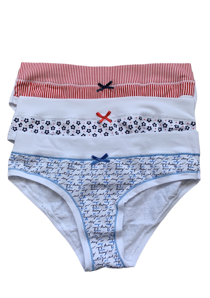 Dámske bavlnené nohavičky obľúbeného strihu. Jemné, hladké nohavičky s potlačou. Po obvode je pohodlný široký pružný pás a do vnútorného dielu je všitý malý klin na komfortné nosenie. Farba nohavičiek Vám bude vybraná náhodne alebo môžete farbu napísať do poznámky. Uvedená cena je za jeden kus.